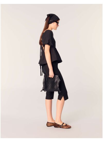Ce top offre un jeu de volumes avec des manches ballons élastiquées et une basque volantée. Une encolure carrée et un dos ouvert, orné de liens à nouer, apportent une touche d’élégance.