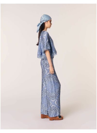 Il s'associe au pantalon et au foulard coordonnés, complété par des lunettes de soleil et des sandales compensées.