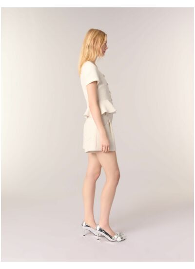 Ce top peplum en tweed fantaisie joue avec les lignes, muni d'une encolure ronde et une basque effet volanté. Une fermeture à boutons bijoux strassés illumine l'allure.