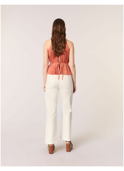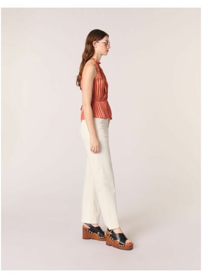 Avec ses emmanchures américaines et ses petits volants au col, ce top satiné plissé adopte une teinte chaude, évoquant le coucher de soleil. Une fente nouée au dos crée une légère basque, apportant une touche romantique.