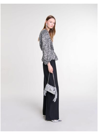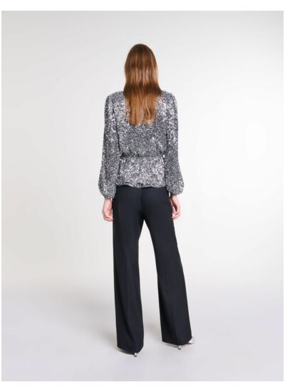 Ce top est-il adapté pour des occasions spéciales ? Oui, sa finition à sequins apporte une touche festive idéale pour les soirées, cocktails ou événements où l’on souhaite se démarquer avec subtilité et raffinement. Son design reste suffisamment sobre pour être porté aussi en journée avec les bons accessoires.