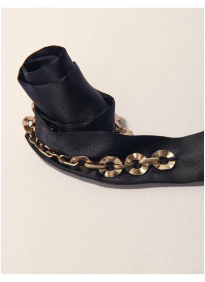 Élégant et versatile, ce foulard fin offre différents portés : en bracelet ou en ceinture de taille, noué sur la tête ou autour du cou. Il dévoile une chaîne à maillons travaillés et martelés dorés, ainsi que des pampilles Clover.