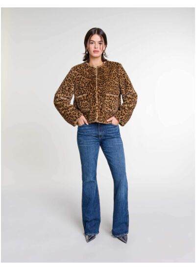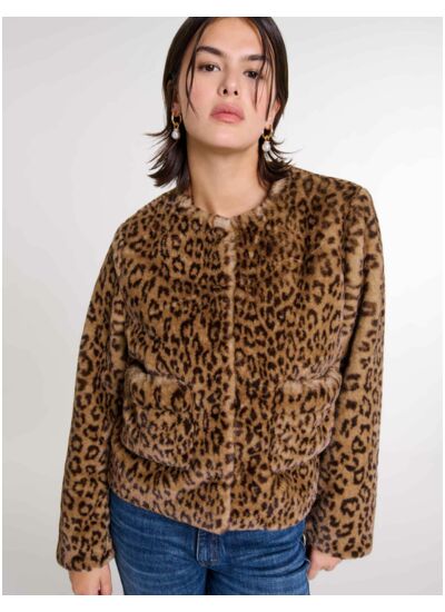 Ornée d’un imprimé léopard, cette veste courte en fausse fourrure affirme une silhouette résolument chic et audacieuse. Dotée d'un col rond, de manches longues et de deux poches, elle se ferme élégamment avec un crochet.