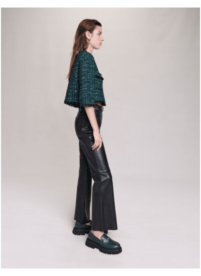 Idéale pour illuminer votre vestiaire, l’incontournable veste en tweed se réinvente avec une coupe courte dans la couleur phare de la saison: le vert bouteille. Dessinant une silhouette structurée en toute élégance, elle dévoile un col rond, des manches 3/4 et des bords délicatement frangés. Sa fermeture et ses deux poches plaquées se parent de boutons travaillés, le détail chic qui apporte un supplément d’audace à votre allure.