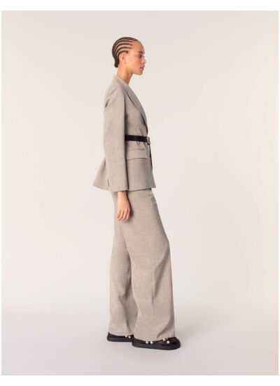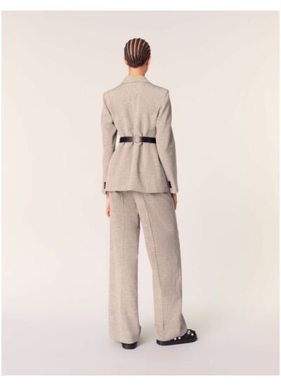 Quelle coupe propose la veste MFPVE00652 de Maje ? Cette veste tailleur offre une silhouette structurée et élégante, parfaitement ajustée grâce à sa ceinture intégrée qui souligne la taille pour un rendu féminin et moderne.