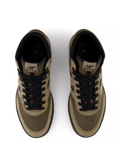 La NB NUMERIC 440 HIGH V2 présente une tige en cuir et textile renforcé, une semelle extérieure en caoutchouc vulcanisé, et un système de laçage sécurisé. Sa conception haute protège la cheville tout en offrant une flexibilité adaptée au skate.