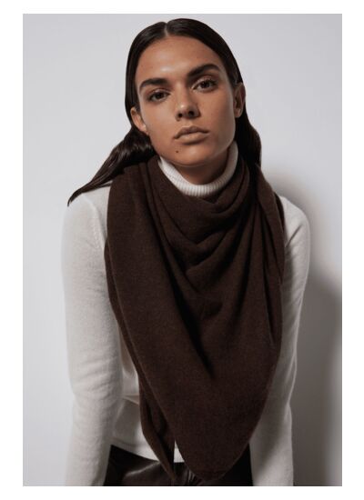 Quelle est la couleur et la forme de cette écharpe ? Elle présente une teinte marron foncé élégante et intemporelle, en forme de triangle, idéale pour un port moderne et polyvalent.