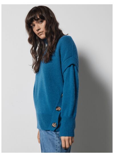 Le pull présente une coupe ajustée avec un col roulé classique rehaussé par des boutons bleu foncé, apportant une touche élégante et moderne à un basique intemporel.