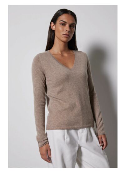 Avec quelles tenues associer le pull col V Neva ? Sa teinte beige neutre s’accorde facilement avec un jean, un pantalon chino ou une jupe. Il apporte une touche élégante et décontractée à toutes vos tenues quotidiennes.