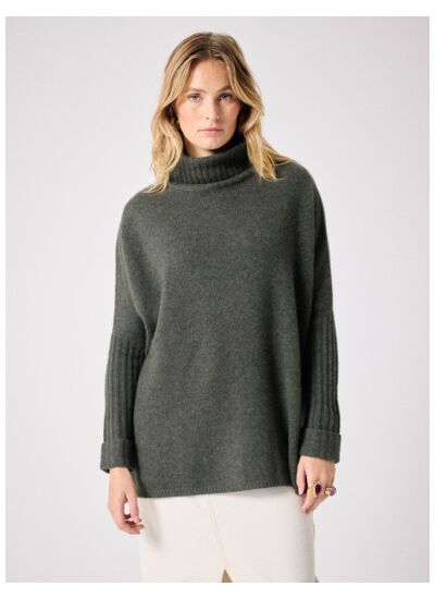Ce modèle combine l’élégance d’un poncho à manches longues avec un col roulé ajusté, offrant une silhouette moderne et décontractée. Il s’adapte parfaitement à un look casual chic ou à une tenue plus sophistiquée.