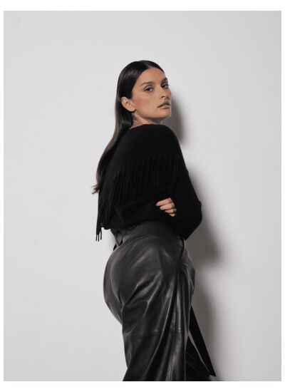 Quelle est la particularité du dos à franges sur ce pull ?