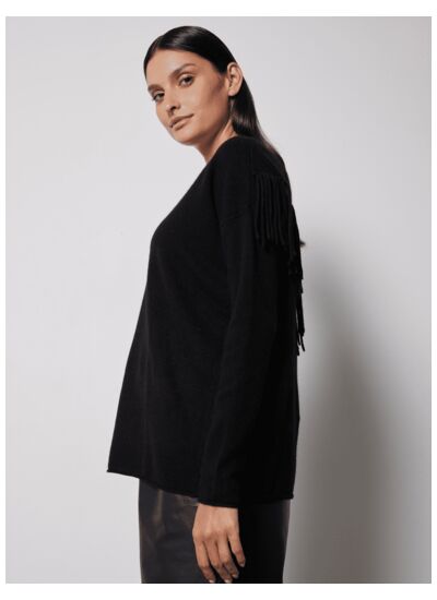 Col V avec dos à franges noir 100% cachemire 2 fils 12GG