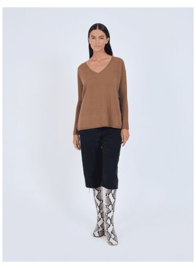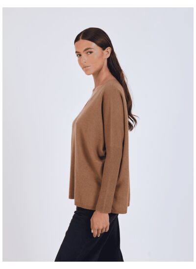 Pull poncho camel femme en cachemire 2 fils 12GG, col V, manches longues