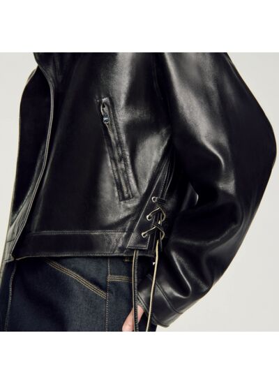 Blouson en cuir vieilli aspect vintage, muni de manches longues, d'un col large, d'une fermeture à boutons pression, de poches zippées, et orné de détails lacés sur les cotés.