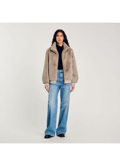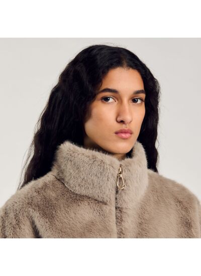 Blouson en fausse fourrure muni d'un col montant, de manches longues et d'une fermeture zippée.