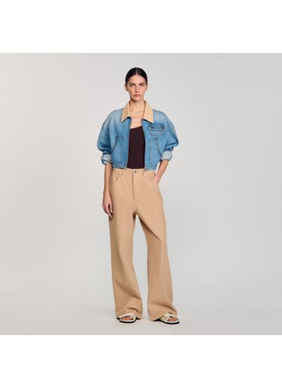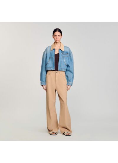 Blouson court en jean orné de studs aux poches, muni d'un col à revers en gabardine contrastée, d'une fermeture zippée et de manches longues.