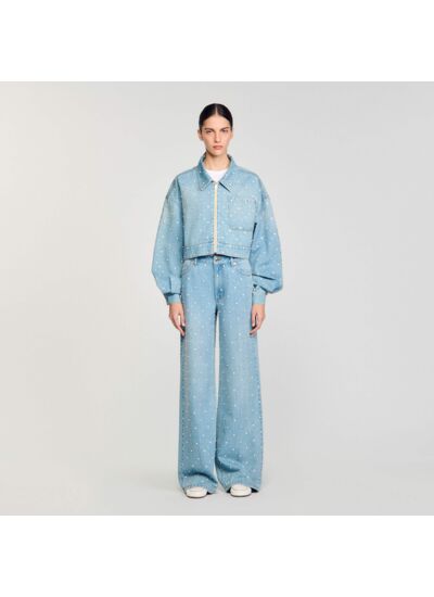 Blouson court en jean orné de strass et de perles all over, muni d'un col à revers, de manches longues, d'une fermeture zippée et d'une poche plaquée.