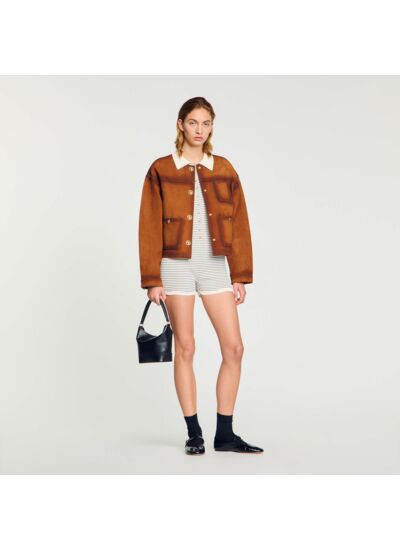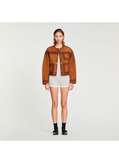 Blouson en suède double face à finitions contrastées, muni d'un col rond, de manches longues, d'une patte de boutonnage et de poches plaquées.