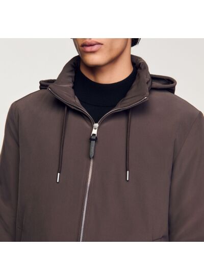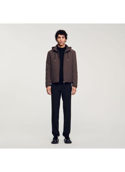Blouson en tissu technique muni d'une capuche et d'une fermeture zippée.