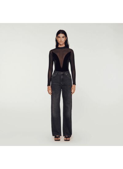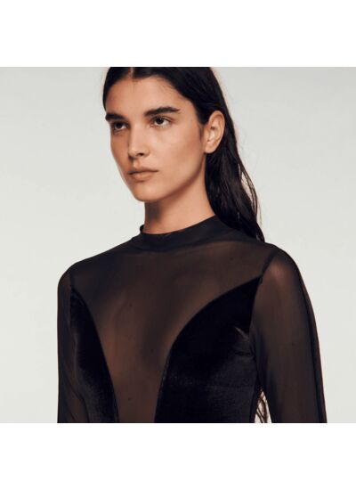 Body en résille et velours muni de manches longues, d'un col montant et d'un décolleté en cœur plongeant.