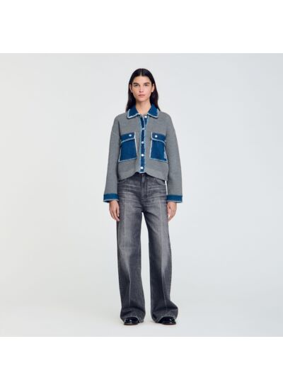 Quelles sont les matières principales du cardigan SFPCA01045 ? Ce cardigan combine une maille douce et un tissu jean, offrant un équilibre parfait entre confort et style décontracté.