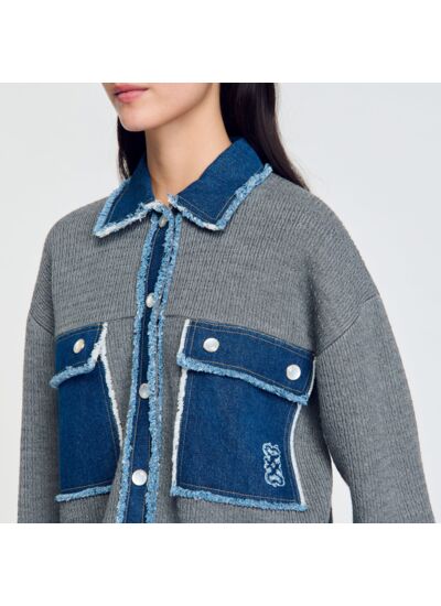 Cardicoat bimatières en maille à empiècements en jean effiloché contrasté, muni d'un col chemise, de manches longues, d'une fermeture boutonnée et poches plaquées.