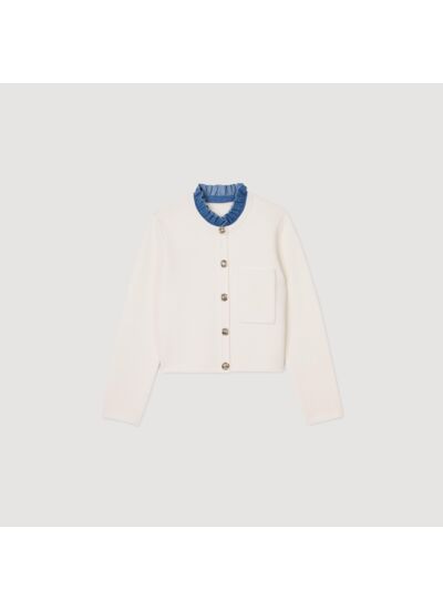 Cardigan en maille à points fantaisie muni d'un col rond à volant contrasté amovible, de manches longues, d'une fermeture boutonnée à boutons fantaisies et d'une poche plaquée à la poitrine.