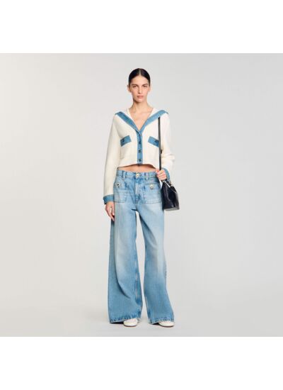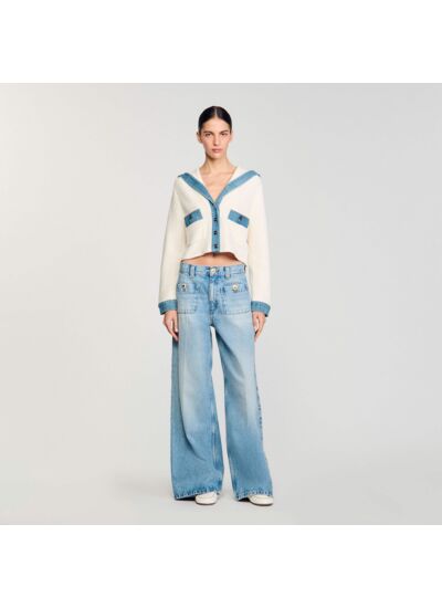 Cardigan en maille bouclette à détails denim, muni d'un col marin, de manches longues, de poches à rabats et d'une patte de boutonnage.