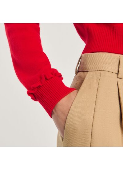 Cardigan laine et cachemire muni d'un col rond, de manches longues à poignets ornés d'un détail volant.