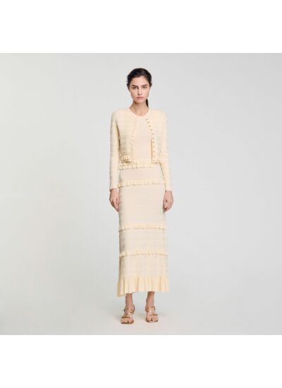 Cardigan court en maille fantaisie, muni de manches longues, d'une patte boutonnée, et de volants sur le bas.