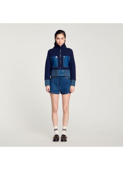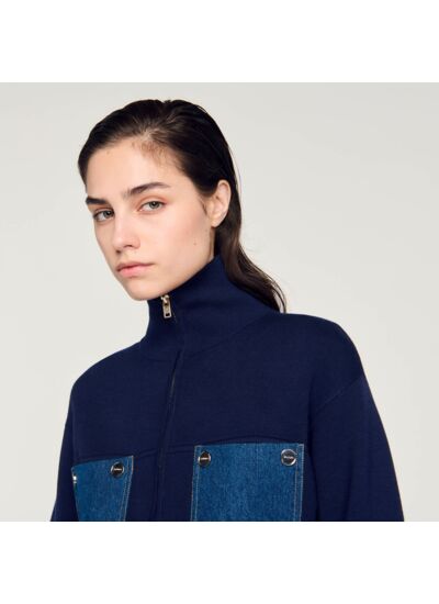 Cardigan en maille et empiècements en denim muni de manches longues à poignets smockés, d'un col montant, de poches plaquées en denim, d'une fermeture à boutons pressions et d'un bas smocké.