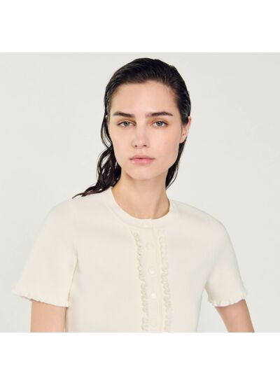 Cardigan court en maille fine muni de manches courtes, d'une fermeture à boutons ornée de volants et d'un col rond.