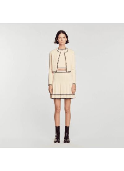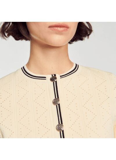 Cardigan court en maille pointelle orné de liserés à rayures contrastantes, muni d'un col rond, de manches longues, et d'une fermeture à boutons pression SANDRO.