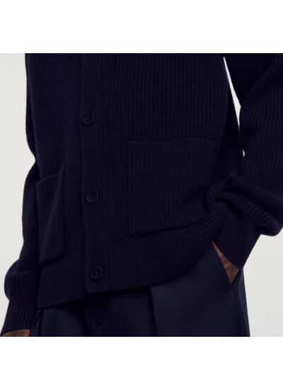 Cardigan droit en maille côtelée muni d'un col en V, de manches longues, d'une fermeture boutonnée et de poches plaquées.