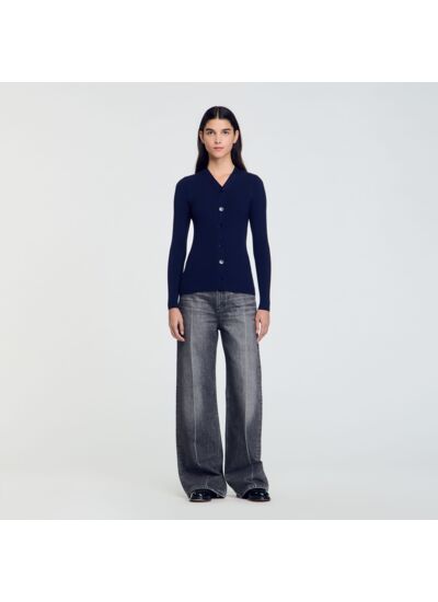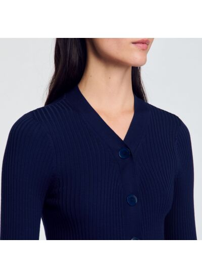 Cardigan en maille fine côtelée muni d'une encolure en V, d'une fermeture boutonnée à boutons siglés SANDRO et de manches longues.