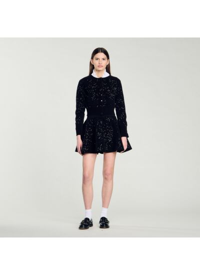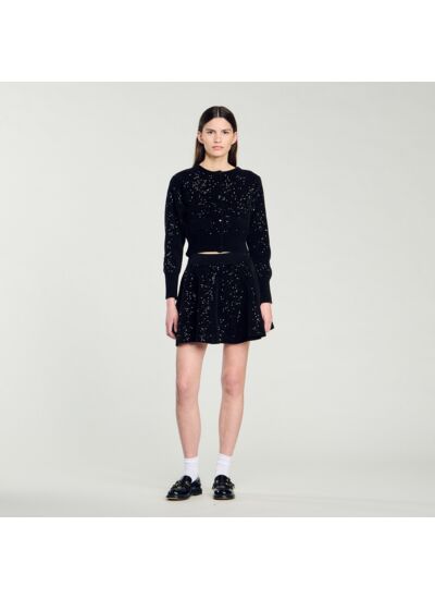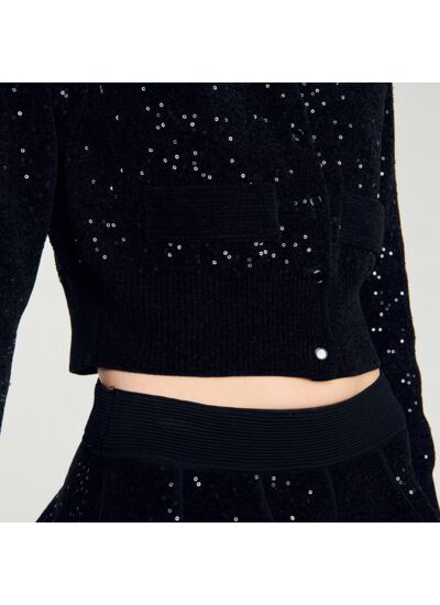 Cardigan court en maille velours pailletée muni d'un col rond, de manches longues, d'une fermeture à boutons pression, d'un bas et de manches cotelés resserés.