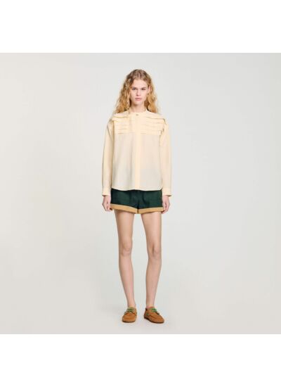 Chemise à manches longues, bandes plissées sur le devant, patte de boutonnage recouverte et col rond orné d'un bouton perle.