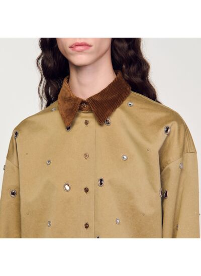Chemise courte et large 'box' en enzyme wash avec col en velours contrasté, ornée de strass fantaisie en all over et munie de manches longues à poignets boutonnés.
