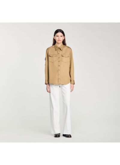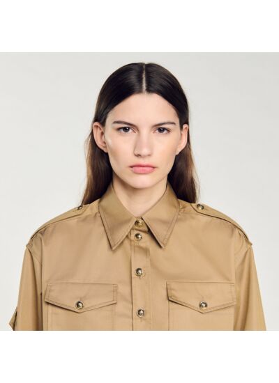 Chemise à manches longues munie d'une fermeture à boutons en métal, de poches plaquées à la poitrine et de pattes boutonnées aux épaules.