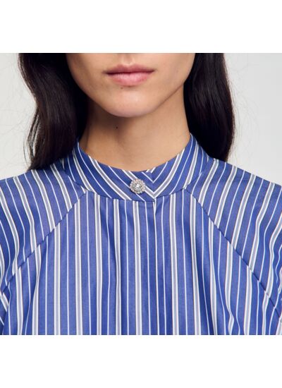 Chemise courte à rayures munie de manches longues, d'une fermeture boutonnée et d'un col rond à bouton bijou.