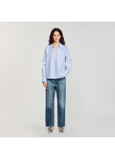 Chemise à rayures en coton et lin ornée de galons de dentelle , munie d'un col à revers plongeant, de manches longues, et d'un bouton fantaisie.