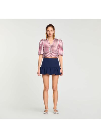 Chemise courte à rayures, munie de manches courtes bouffantes, d'un col en V , d'une patte de boutonnage à boutons perlés et de volants froncés en finitions.