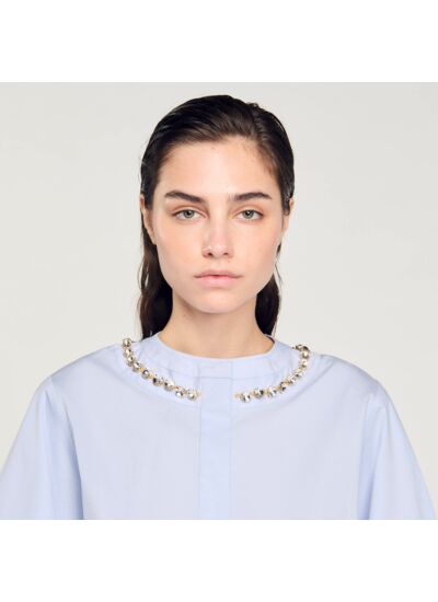 Chemise courte et large munie d'un col rond orné d'un galon bijou, d'une fermeture boutonnée à patte recouverte, de manches longues et larges à ourlet surpiqué et d'un pli creux au dos.