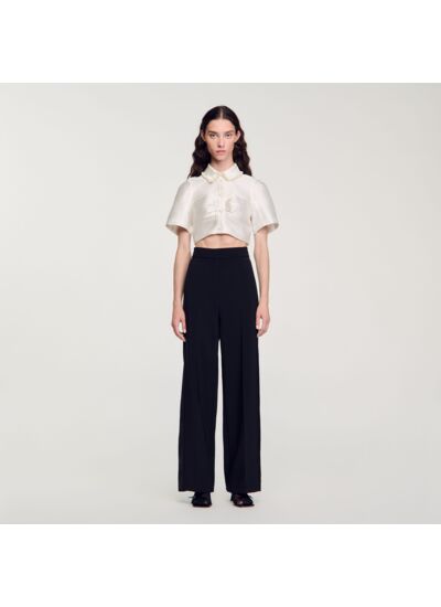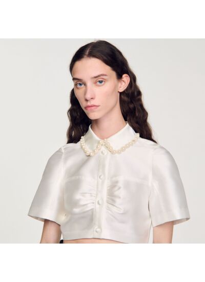 Chemise courte satinée munie d'un col orné de perles, de manches courtes, d'une fermeute à boutons recouverts et d'un jeu de fronces .