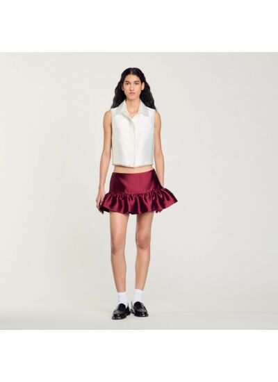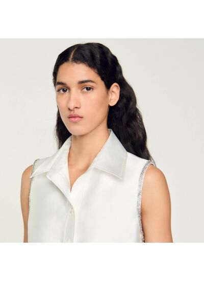 Chemise courte sans manches en satin lourd munie d'un col classique, d'une fermeture boutonnée et ornée d'un galon strassé.