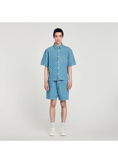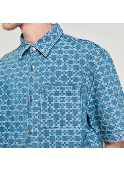 Chemise en denim jacquard Square Cross contrasté munie d'un col classique, de manches courtes, d'une fermeture à boutons-pression et d'un logo Sandro en métal à la poitrine.