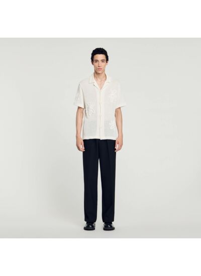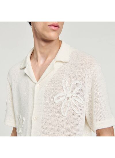 Chemise en maille ajourée composée de coton, munie d'un col hawaïen, de manches courtes, d'une fermeture à boutons nacrés.