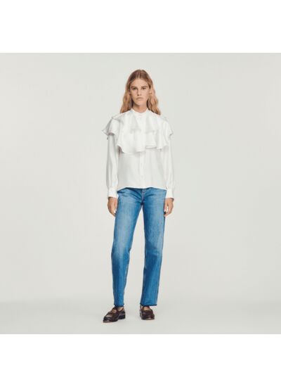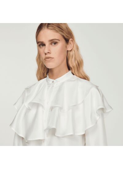 Chemise fluide en soie munie de manches longues à poignets resserrés, d'une fermeture boutonnée et ornée de larges volants.