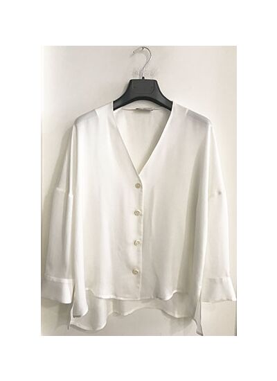 Chemise fluide plus longue au dos, munie de manches trois quarts volantées et d'une fermeture boutonnée.