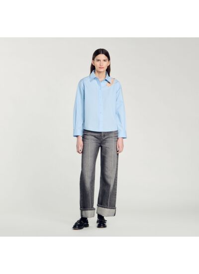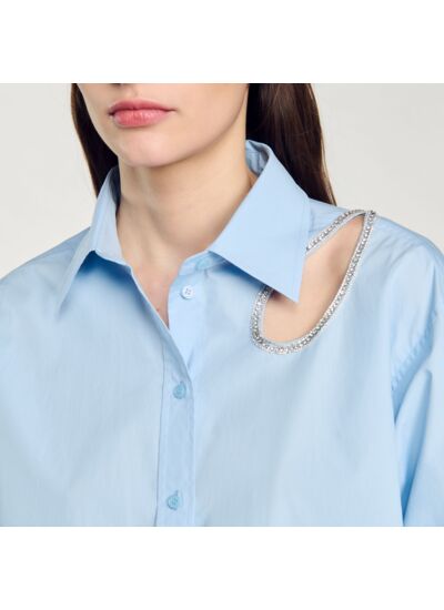 Chemise en popeline munie d'un col classique, de manches longues à poignets boutonnés et d'une fermeture boutonnée, ornée d'un détail goutte ajourée strassée à l'épaule.